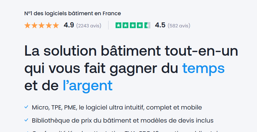 Avec plus de 31 000 utilisateurs, le logiciel affiche une belle progression en France. Il obtient une note moyenne de 4,5/5 sur Trustpilot (près de 600 avis recensés). L’objectif de cette analyse est de faire ressortir ses atouts, ses points faibles et son positionnement tarifaire, afin d’aider chaque artisan à déterminer s’il s’agit du bon outil pour lui.